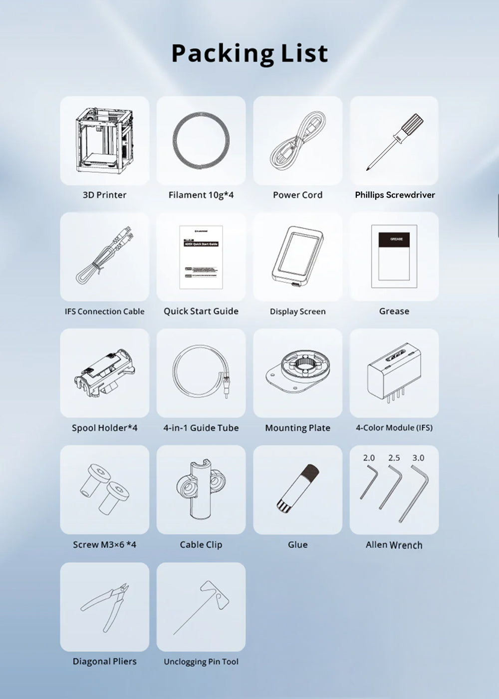 Simply install the screen, filament holder, and multicolour printing module. All is done.