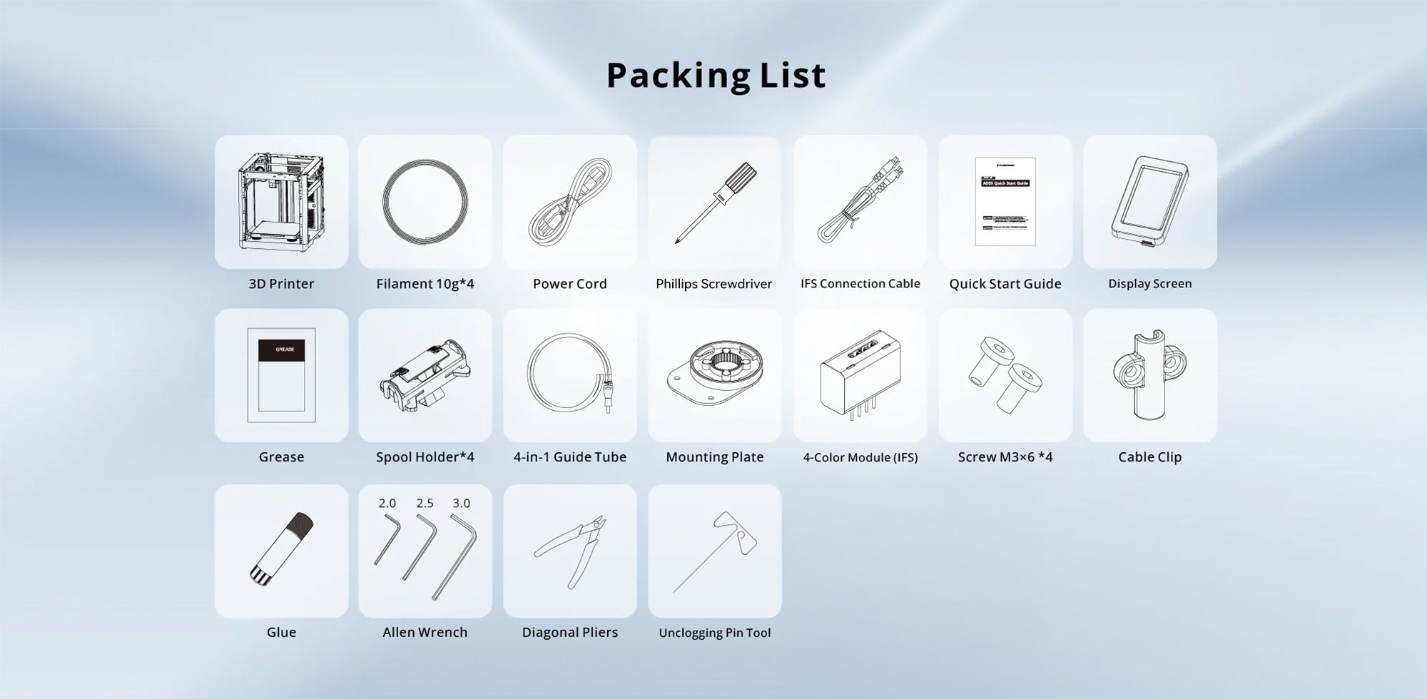Simply install the screen, filament holder, and multicolour printing module. All is done.